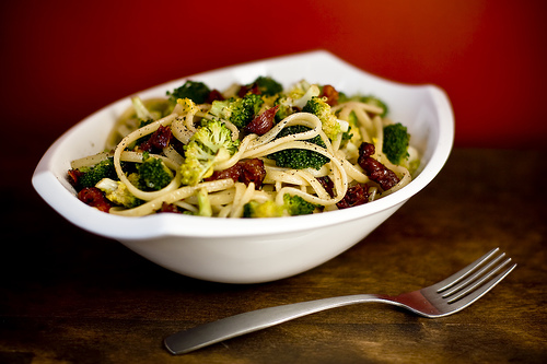 Cuando la pasta está casi lista, calentar un wok a fuego mediano. Añadir el aceite y el brócoli y remover.