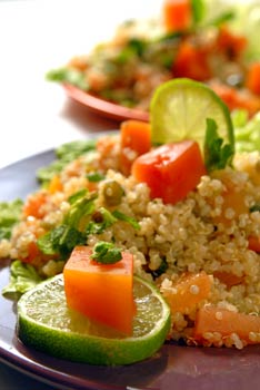 Mezclar la quinoa cocida y fría con las naranjas, zanahorias, jugo de limón y menta.
