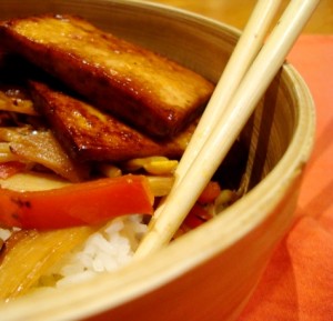 Calentar el aceite en una sartén. Añadir la cebolla, el pimiento verde y rojo. Freír 2 o 3 minutos.