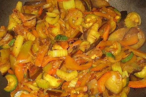 Pelar las cebollas y filetearlas en juliana fina. Limpiar la berenjena y cortarla en dados pequeños. Exprimir un limón por encima de la berenjena para que no ennegrezca y reservarla. Lavar el calabacín, despuntarlo, partirlo por la mitad y después en medias lunas.