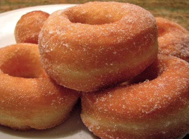 Dorar por ambos lados y sacar a un plato o recipiente con papel absorbente de cocina. Y bañarlo en azúcar mientras está aún caliente.