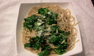 Servir la pasta con un poco de espinacas y piñones por encima.