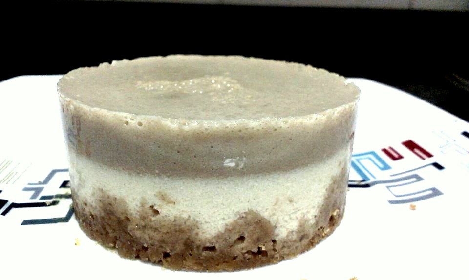 Utilicé 4 galletas tipo digestive, las chafé con un portero y luego lo mezclé con un poco de margarina vegana,lo puse en el molde, en un cazo calenté medio vaso de leche de soja con una cucharada de poste de agar agar en polvo, lo puse en el fuego y cuando empezó a hervir le añadí una cucharada de postre de zumo de limón y medio yogurt de soja lo mezclé bien y lo retiré del fuego y lo puse encima de la galleta , y lo dejé enfriar hasta que cuajó en el congelador, luego agarré un cuarto plátano y lo corté a trozos, le añadí media taza de leche de soja y lo pasé por la batidora, una vez la mezcla está hecha la pones en un cazo y al fuego con una cucharada de postre de agar agar en polvo. Cuando empiece a espedar, lo retiras y lo añades en el molde es simple y rico rico.