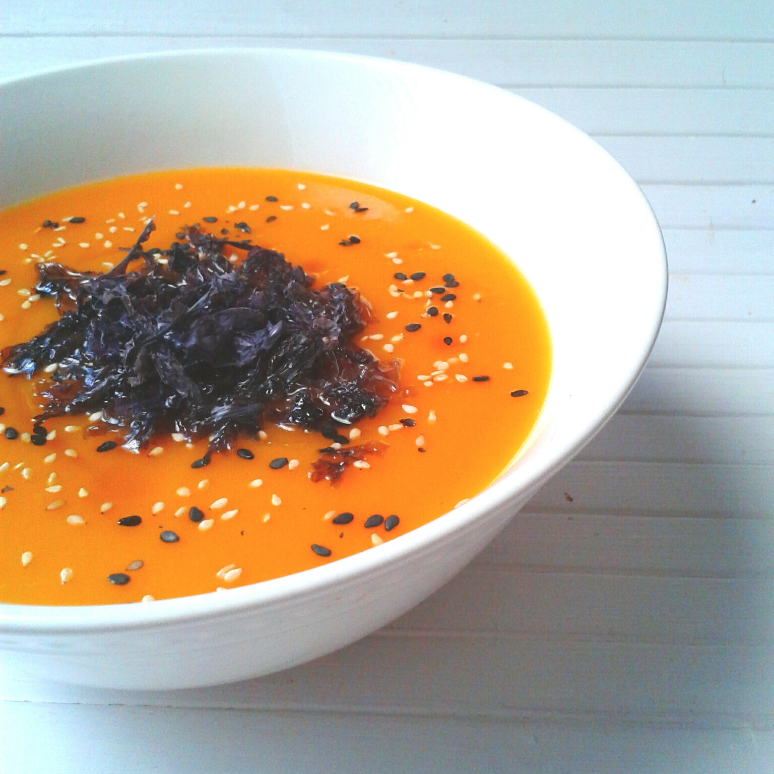 Hoy os traigo una crema de calabaza pero con un toque oriental que no deja indiferente a ningún paladar. calabaza, jengibre, aceite de sésamo, salsa de soja y alga nori son las protagonistas de este nutritivo primer plato para este frío invierno. ¡espero que os guste y os animéis a probarla!