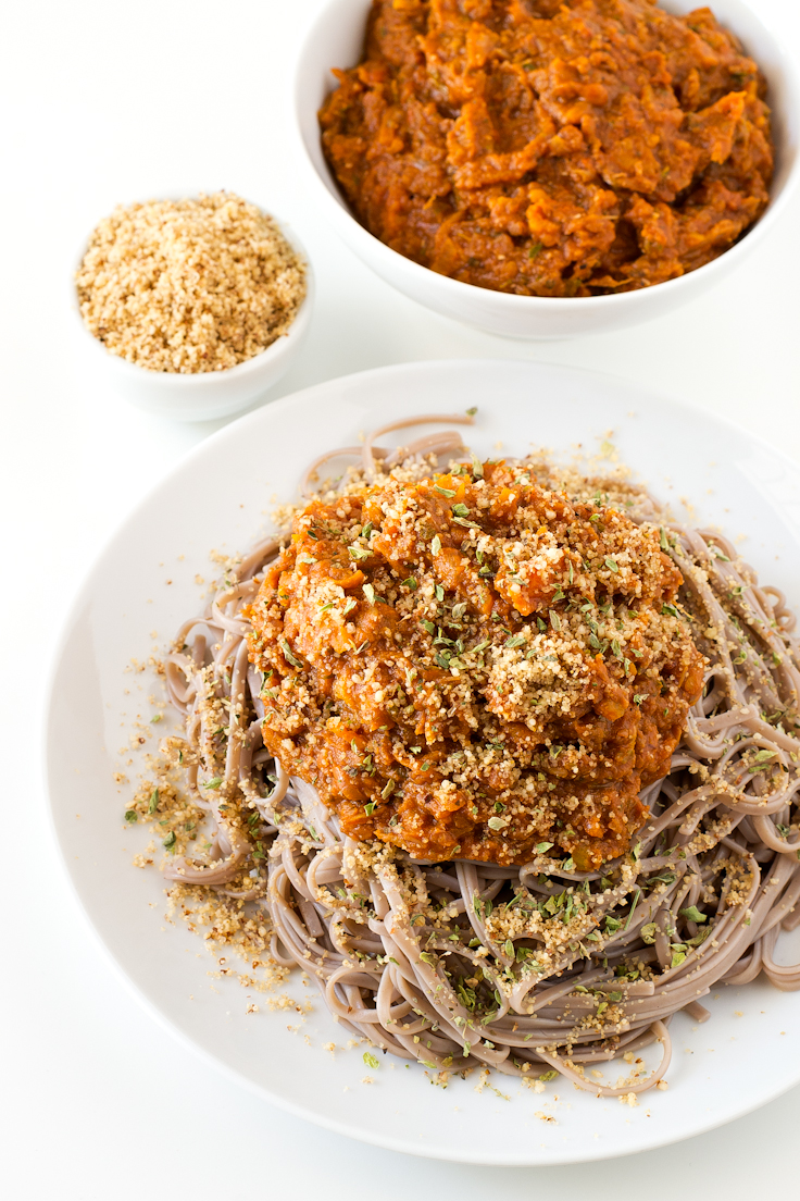 Servir los fideos de soba con la salsa boloñesa y un poco de queso parmesano vegano en la parte superior. Añadir orégano para decorar (opcional).