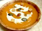 Sirve la crema de zanahorias en el plato y adereza con una buena cucharada de la crema de coco, unas pasas escurridas, los dados del pan de ajo y las pipas de calabaza.