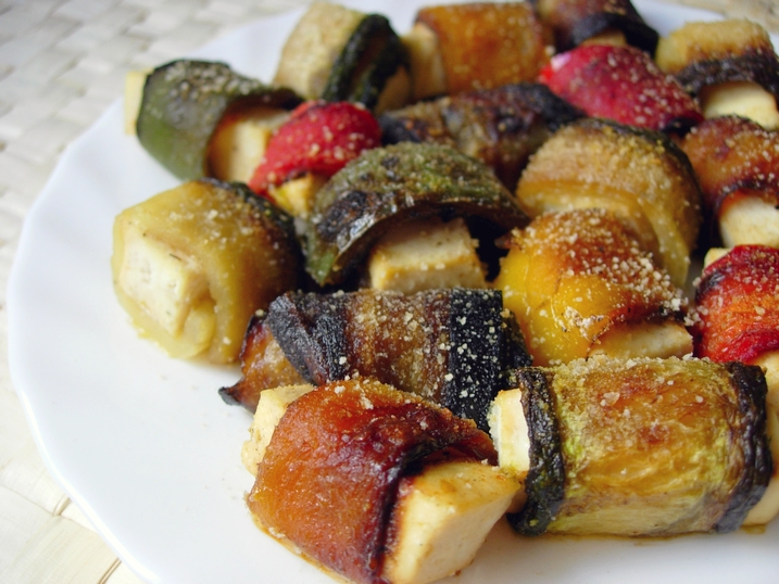 Corta el tofu en tiras estrechas y éstas, a su vez, en dados. Coloca cada trozo de tofu sobre las tiras de verdura y enróllalas con cuidado. Espolvorea todo con pan rallado justo antes de servir, una pizca de sal y gratina en el horno unos minutos hasta que el pan se dore.