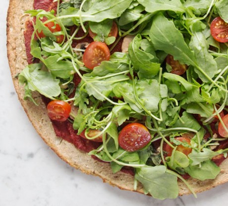 Hornea a unos 200 grados unos 20-30 minutos, si no estás usando un plato para pizza puede que tengas que darle la vuelta a la mitad. Una vez la base es firme y ligeramente crujiente sácala del horno y añade el tomate y otros vegetales, antes de hornear de nuevo por otros 5-10 minutos.