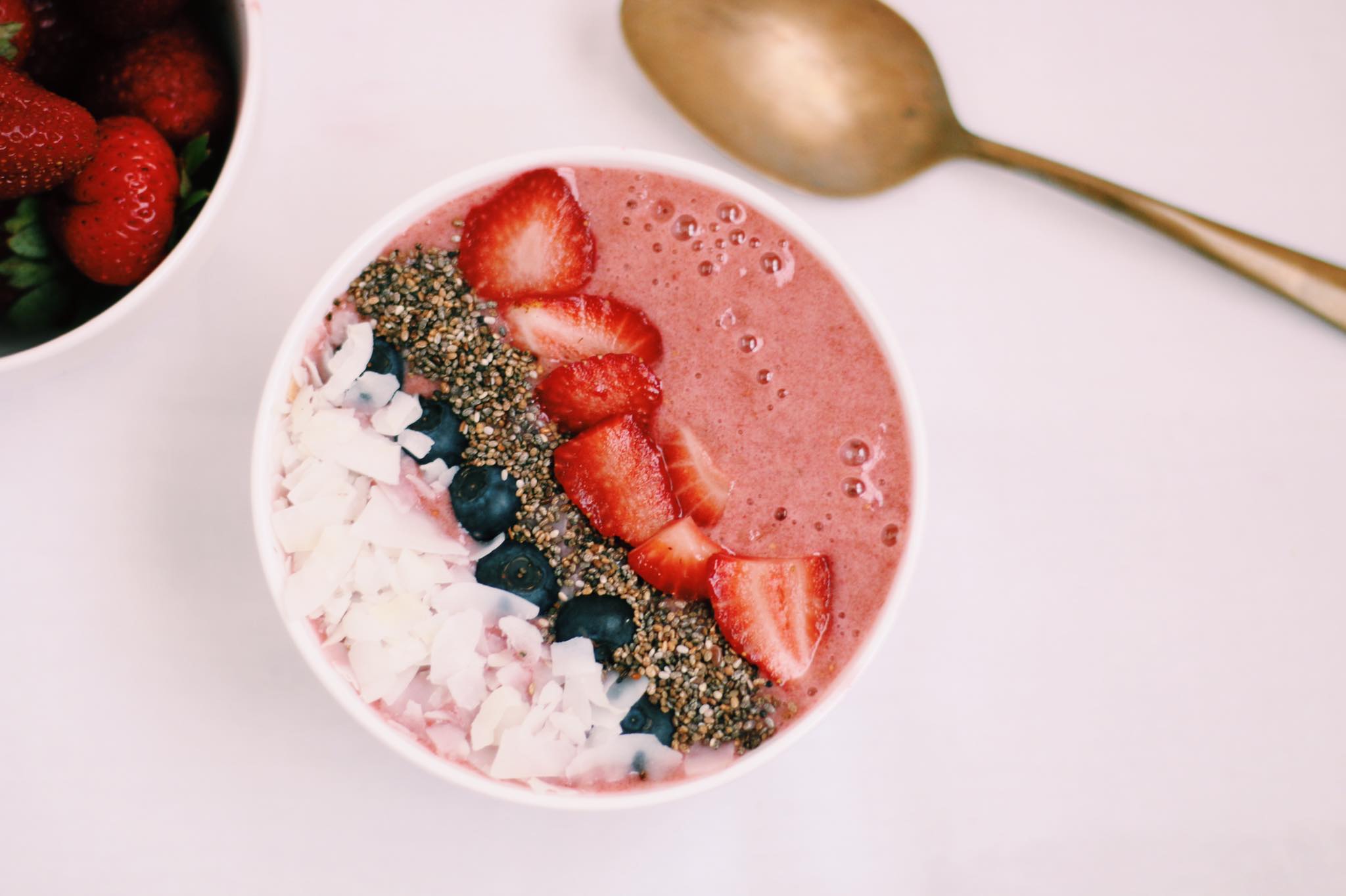 Serví en un bowl bien lindo y decoralo con chia, coco en escamas, arándanos y más frutillas.