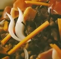 En una ensaladera deposita las lentejas, las cebollas, las zanahorias y las algas previamente escurridas. Aliña todo el conjunto con un poco de aceite de oliva virgen extra, un chorreón de vinagre de manzana y sala al gusto.
