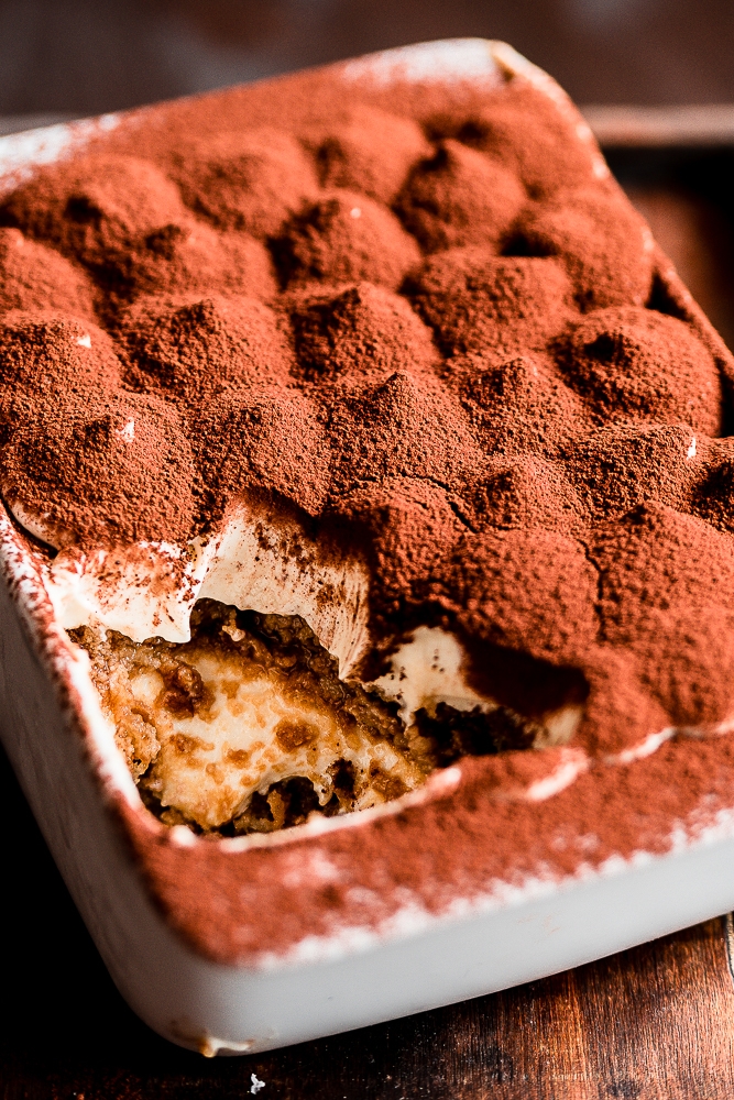 Corta la masa en dos capas y pon una capa en el fondo de cada bandeja que acabas de usar para hornear. Mezcla el café y el alcohol y vierte un cuarto en cada capa de la masa. ( La mitad, si se usa una sola sartén, etc. ) Vierta un cuarto de relleno en cada cacerola. Ponga las masas restantes encima, añada la mezcla de café restante y el relleno restante. Polvo de cacao. Cubre las cacerolas y deja el tiramisú en la nevera durante la noche. Así el relleno se vuelve firme y cremoso.