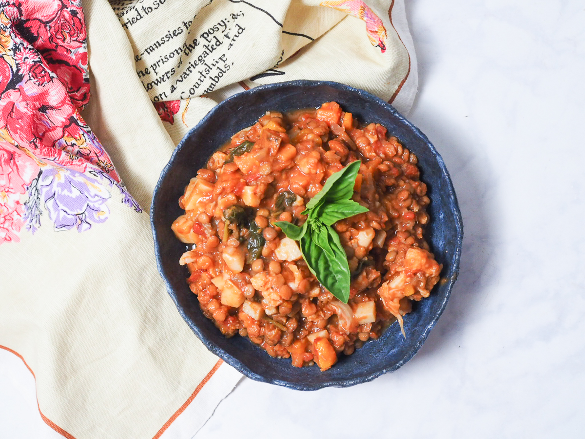 Luego, agregue la batata, las papas, la calabaza y la coliflor antes de agregar los tomates triturados y el caldo de verduras, seguidos de las lentejas.